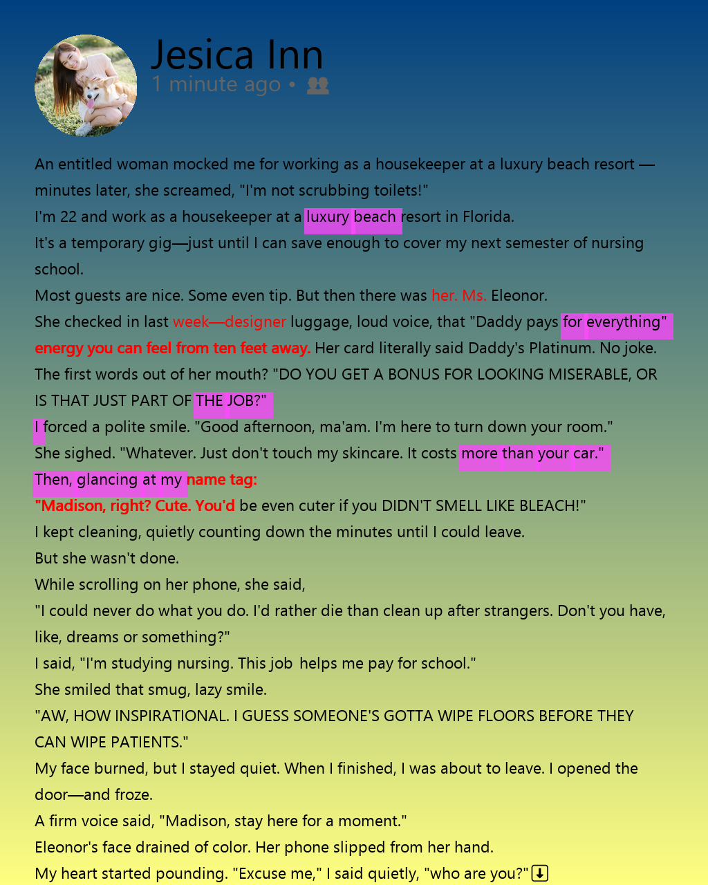 Ms. Eleonor was everything Madison wasn’t—wealthy, spoiled, and used to getting her way. Madison first met her when she was restocking towels in the hallway, and the moment she saw Eleonor dragging her designer suitcases behind her, she knew this woman was not like the others. Eleonor’s appearance and attitude screamed privilege, and her demeanor only confirmed Madison’s suspicions. When Madison knocked on her door for the first time to turn down the room, Eleonor’s comments cut deep. She made rude remarks about Madison’s job and appearance, belittling her for “smelling like bleach” and insinuating that people like Madison were only good for menial tasks.