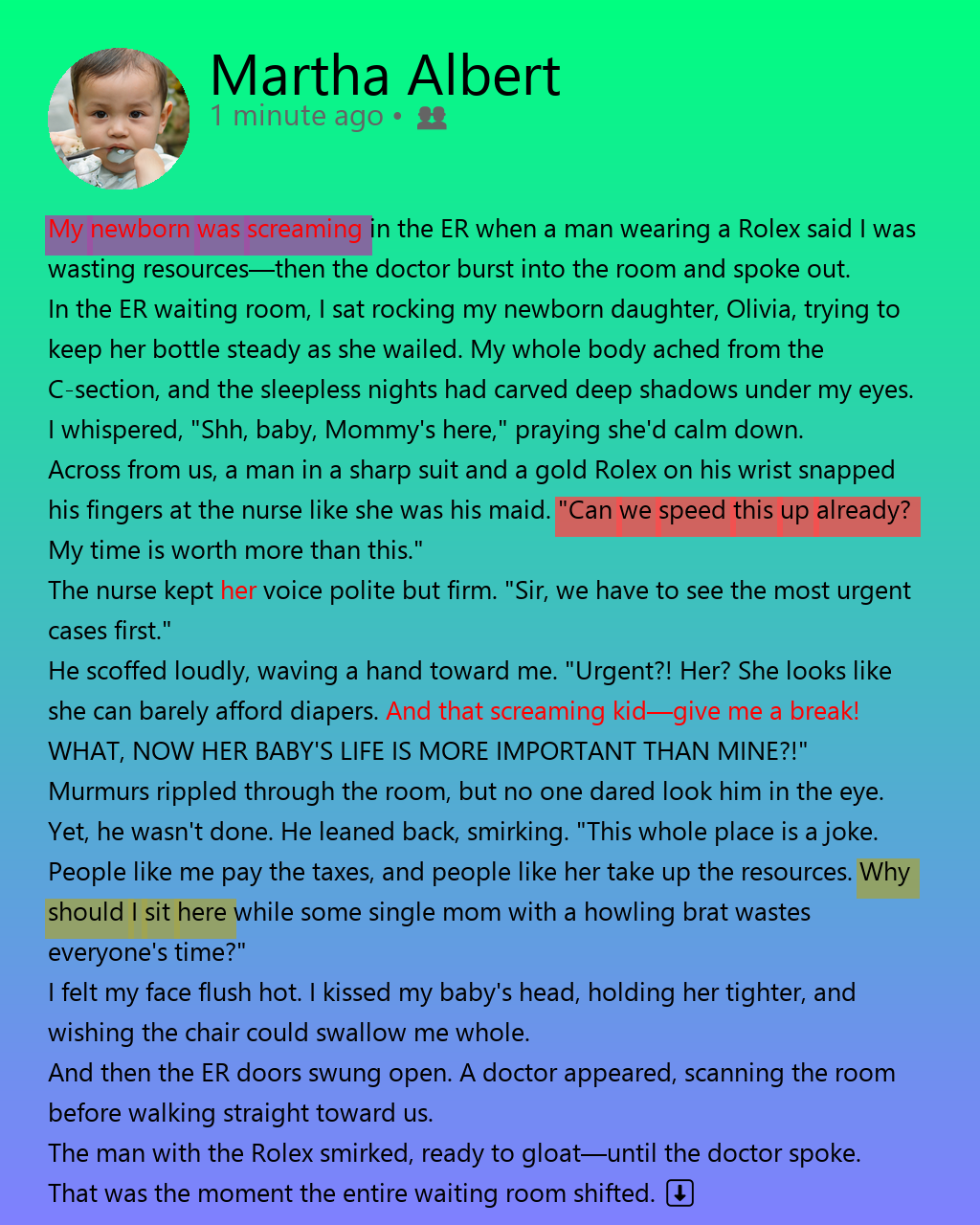 The man was dressed in a sharp suit, wearing a gold Rolex, and exuded an air of entitlement. He tapped his polished loafers impatiently, clearly annoyed at the wait. His voice rang out across the room, loud and dismissive: “Unbelievable. How long are we expected to sit here like this?” He seemed more concerned with his own discomfort than the patients around him. When Martha glanced up, he gave her a condescending look, his eyes scanning her worn appearance and Olivia’s cries with obvious disdain. He made a comment that hit Martha like a slap: “You’re kidding, right? Her? She looks like she crawled in off the street. And that kid — Jesus. Are we really prioritizing a single mom with a screaming brat over people who pay for this system to function?”