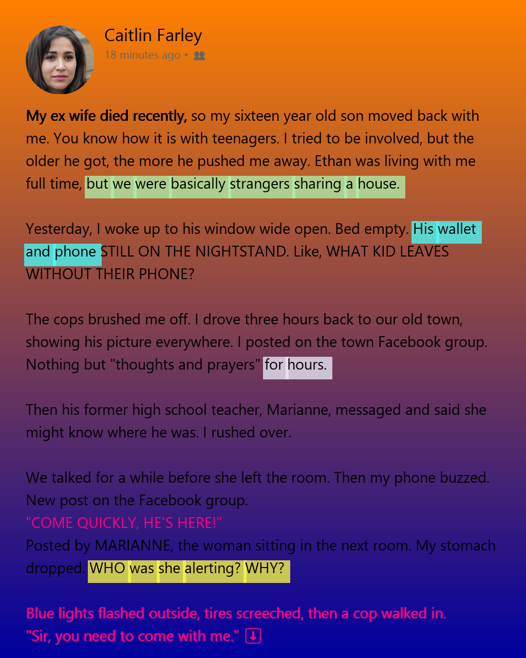 The narrative shifts as the digital cry for help yields a result. While parked outside the town library, David receives a notification from a woman named Marianne, a teacher at the local high school. She claims to know Ethan and suggests she might have an idea of his whereabouts. This lead takes David to a small, cozy house at the edge of town, a setting that contrasts sharply with the cold panic gripping his heart.