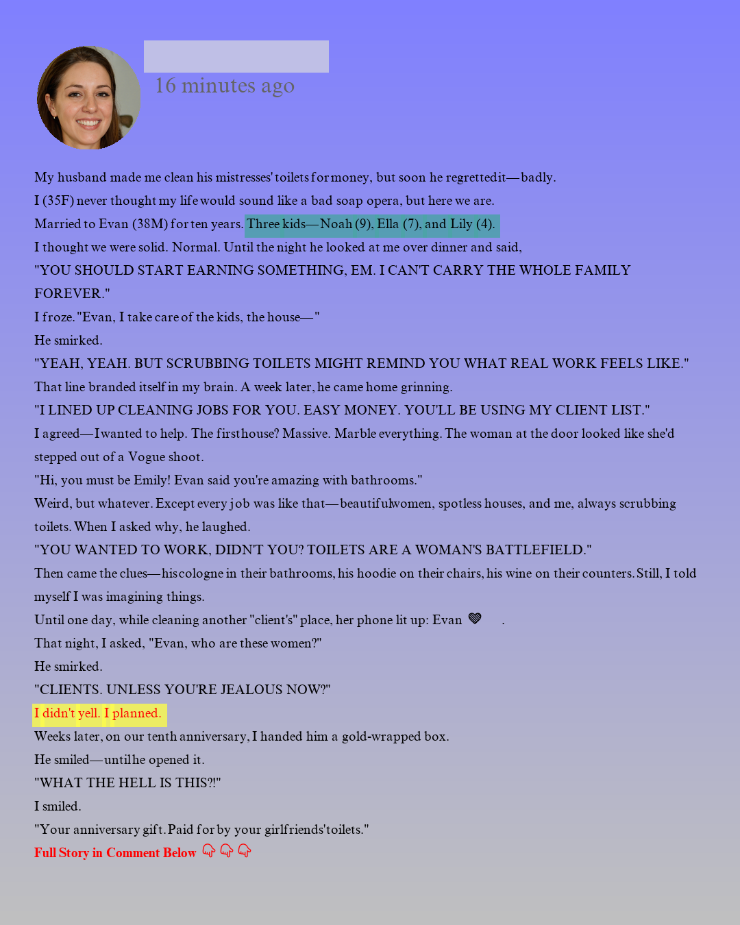I never thought I would become the punchline of my own life. I’m 35 years old, and until recently, I thought I had a strong marriage. It’s not perfect, sure, but it was full of the kind of love you build, not just fall into. That’s what I thought until my husband got me a job cleaning toilets.