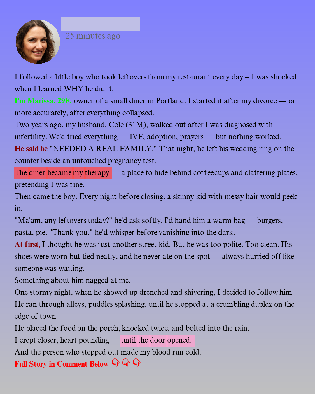 That became our new normal. Every evening around closing time, the boy would show up. He was always polite and always alone. I made sure we had something ready for him, whether it was burgers, spaghetti, grilled cheese, or whatever hadn’t sold. He never lingered or sat down. He just took the food, mumbled a thank-you, and disappeared.