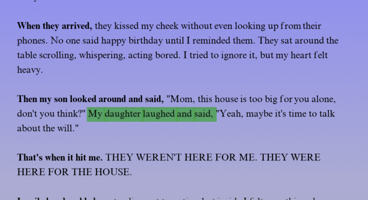 “And I didn’t? When I was working double shifts and sending you money for school? When I helped you buy your first car? I gave you everything. And when I stopped being useful, you stopped visiting.”