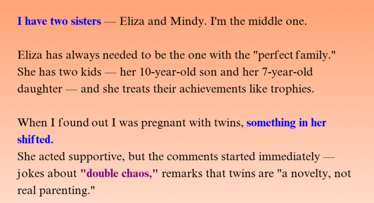 When my twins were born, everyone fussed over them. My parents, our relatives, and even neighbors adored them instantly. And for someone like Eliza, who depends on being the center of attention, that shift must have felt like a spotlight suddenly moving offstage.