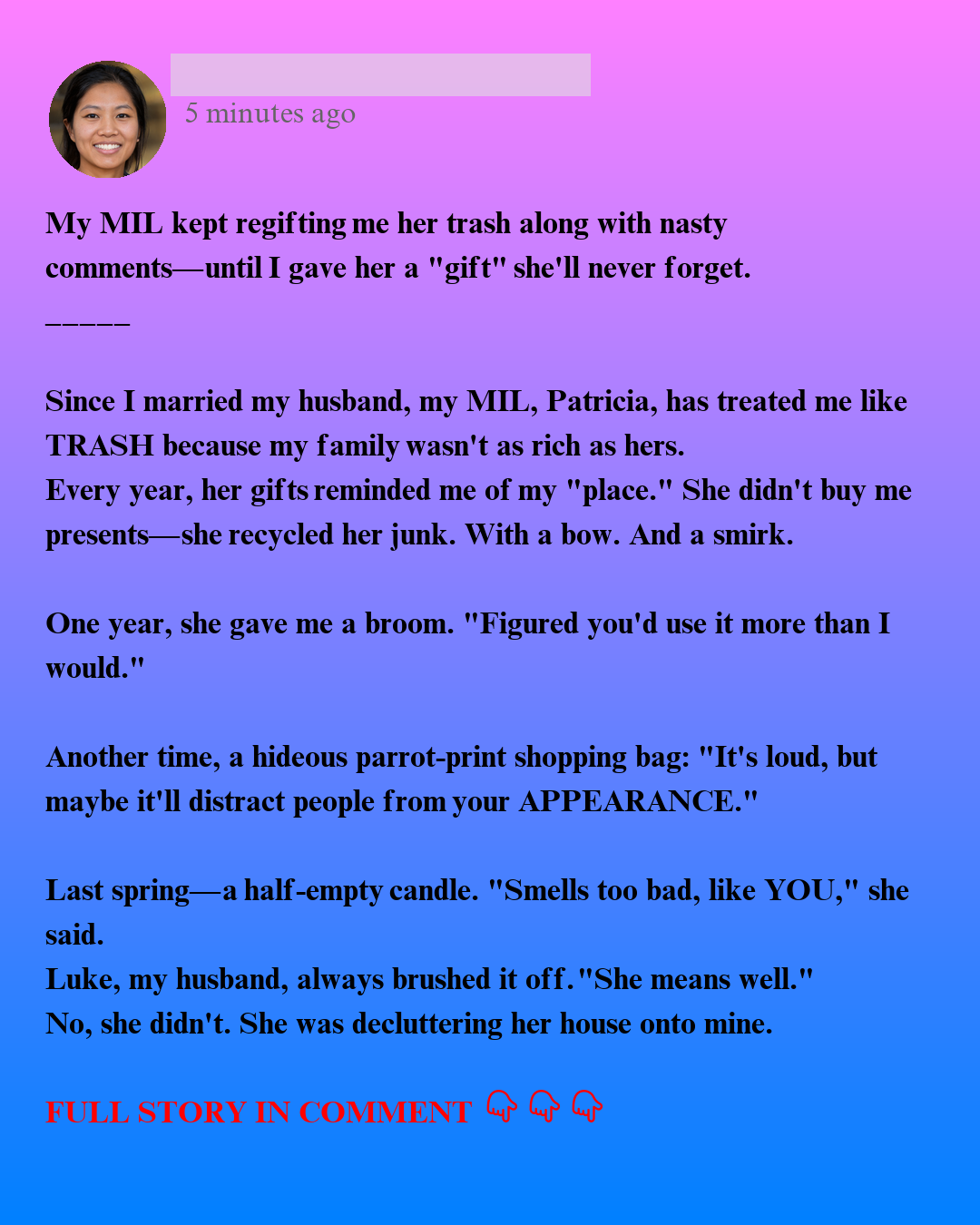 My mother-in-law, Patricia, has always treated me differently. She’s quite mean at times, but the final straw was when she kept regifting me items she didn’t want. I stopped waiting for karma to take over and sought revenge on my own.