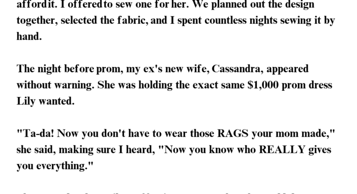 “Surprise!” Cassandra announced, holding the dress up like she’d just solved world hunger. “Now you can go to prom in style instead of wearing whatever your mom cobbled together.”