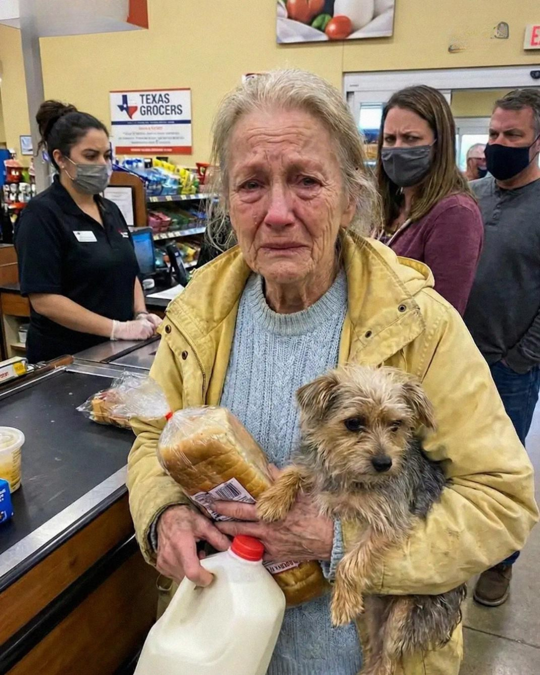 The old woman cradled the bread and milk like they were fragile.