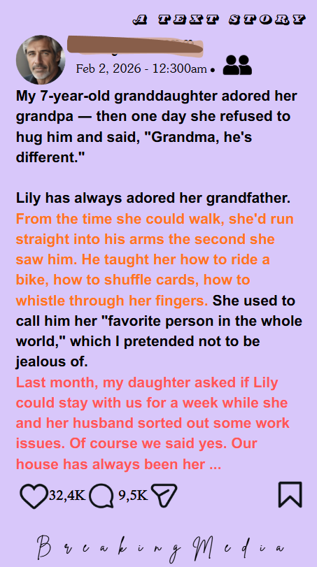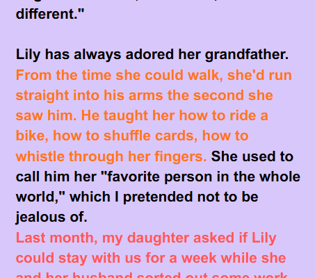 My granddaughter Lily used to run into Grandpa Jim’s arms the second she walked through our door. So when she came to stay with us for a week and suddenly refused to hug him goodnight, I thought she was just tired, until she looked up at me in bed and whispered, “Grandma… he’s different.”