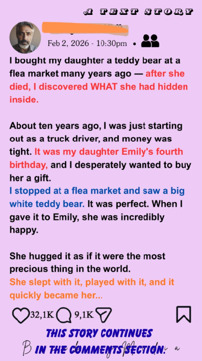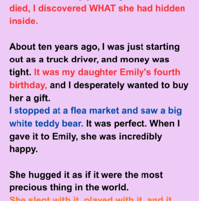 I bought my daughter Emily a giant white teddy bear, and it became our ritual for every truck trip. After she died, it was the only thing I couldn’t let go. Last week, something inside it cracked.