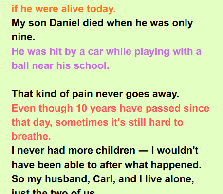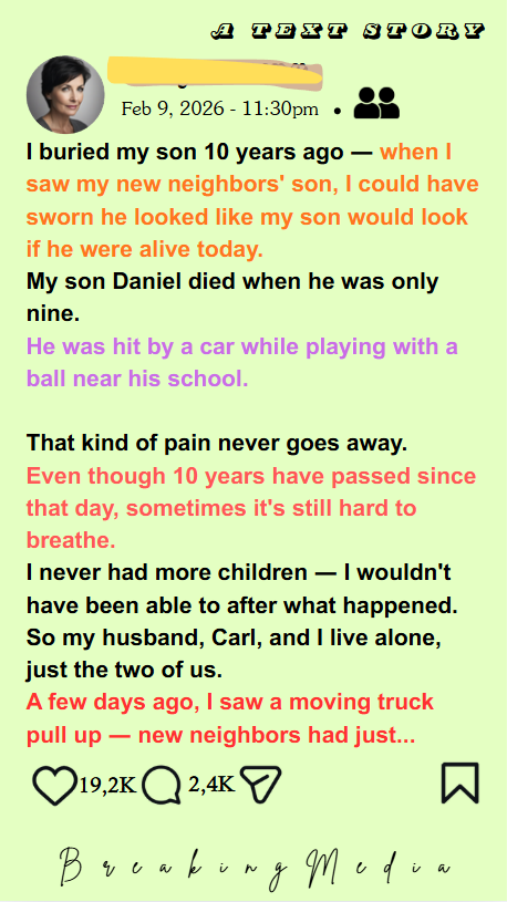 I buried my 9-year-old son ten years ago. When new neighbors moved in, I brought over a pie to welcome them. Their teenage son opened the door… and I nearly collapsed. He had my son’s face! And when I told my husband, he whispered something that changed everything.