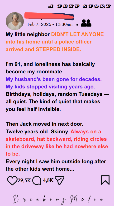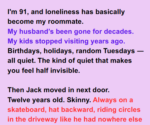 I’m 91 and had basically accepted that my life was going to end in silence—no visitors, no calls, just me and the ticking clock—until a skinny 12-year-old with a skateboard moved in next door, and one night I heard him crying alone on his porch.