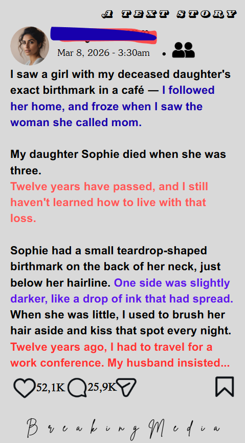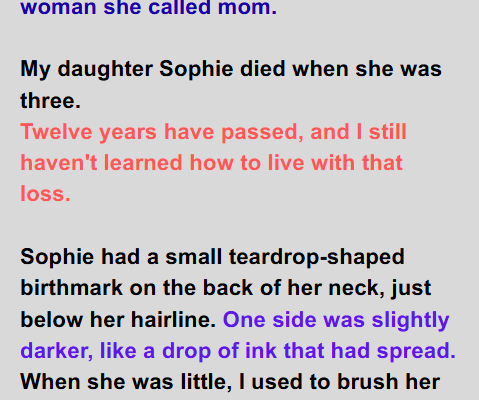 Sophie had a tiny teardrop birthmark on the back of her neck, just below her hairline. Every night, I used to brush her hair aside, kiss that spot, and tell her, “This is my favorite place in the world.”