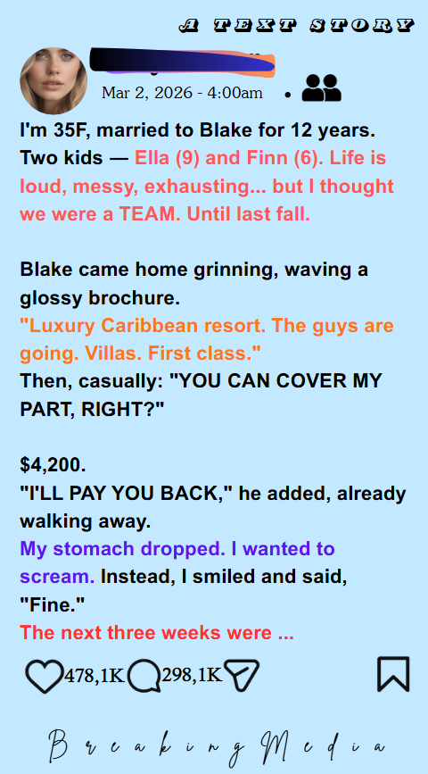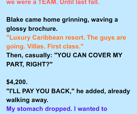 When Blake walked through the door two days later, he looked tanned and rested, like a man who hadn’t missed us at all. He dropped his suitcase like it meant nothing.