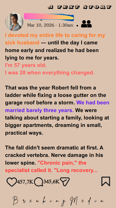 I spent 29 years caring for my disabled husband. Until I came home early and heard steady footsteps upstairs. I watched Robert walk down the stairs unaided, laughing with Celia from church. In that moment, I knew my whole life had been built on a lie.