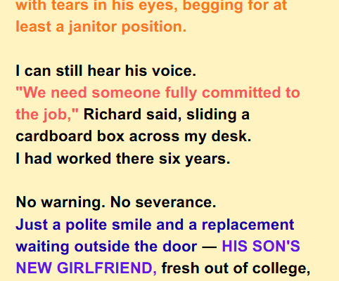 “I know how it feels to lose everything,” I said. “After you fired me, I lost my baby. I lost my fiancé. I lost everything, and I rebuilt it all by myself. I don’t mind giving you a chance to do the same.”