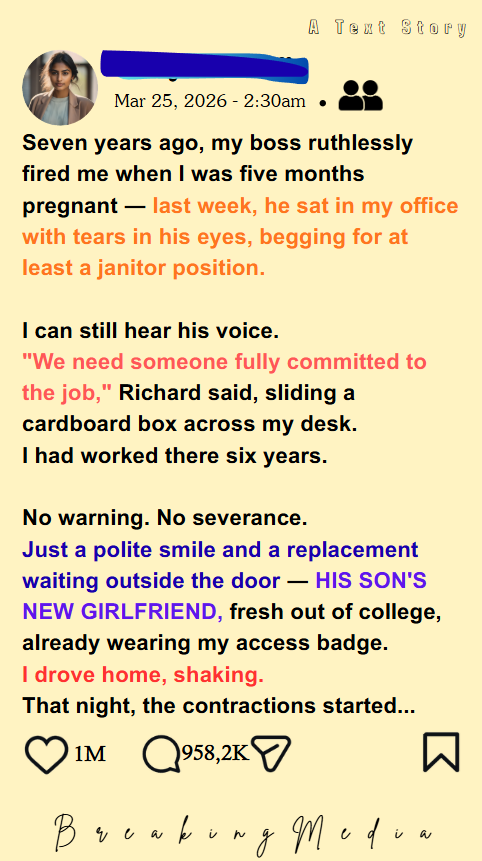 My boss fired me while I was five months pregnant because he needed someone “fully committed.” I buried my baby three days later. Seven years after that, he walked into my office begging for a janitor job. He didn’t recognize me, which gave me the perfect opportunity to teach him a lesson.