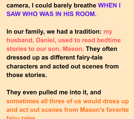 Derrick smiled slightly. “He also told me about the bedtime stories. Daniel also mentioned the costumes, the exaggerated comical voices, and the way Mason would laugh.”