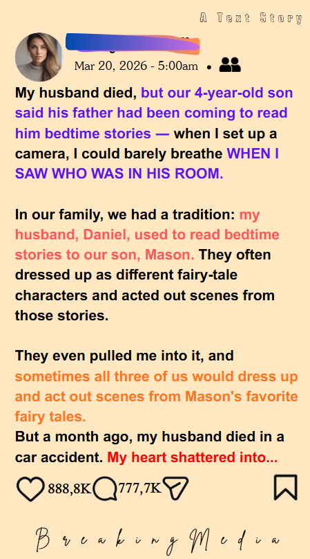 I tightened my grip on the bat. “You’ve got five seconds to explain why you were sneaking into my son’s room dressed like my dead husband.”
