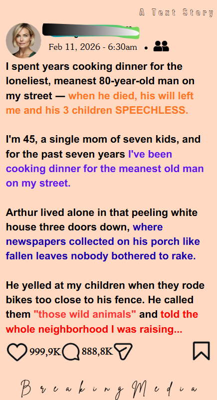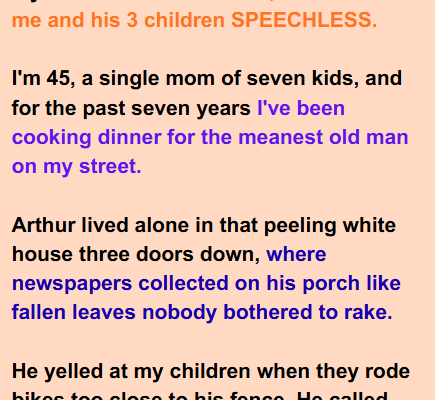 I’m 45 years old, raising seven kids on my own, and for the past seven years, I’ve been cooking dinner for the meanest old man on my street.