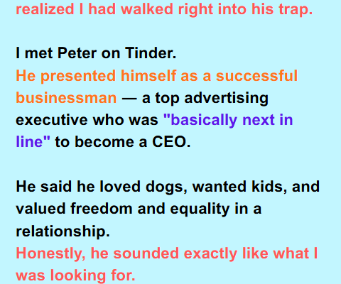 “I didn’t come here for a test, Peter,” I said. “I came here because I thought we had a connection. But if dating people means undermining their beliefs and testing them, then I’m happy to never see you again.”