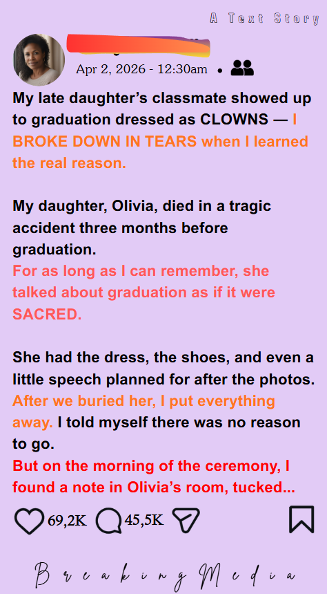 “Liv made us promise that if she couldn’t be here, we’d come as clowns,” Kayla said. “She told us graduation didn’t belong only to the polished kids, the confident kids, the ones who always knew where to stand. She said it belonged to the scared kids too. The awkward kids. The kids who almost didn’t make it through the year.”