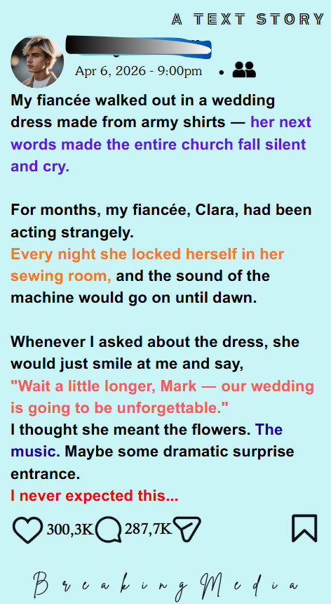 When the church doors opened, my fiancée wasn’t wearing white — she was in a wedding dress made from army shirts. The room went silent. Then she stopped halfway down the aisle, looked at me, and said something that made me think the wedding was over.