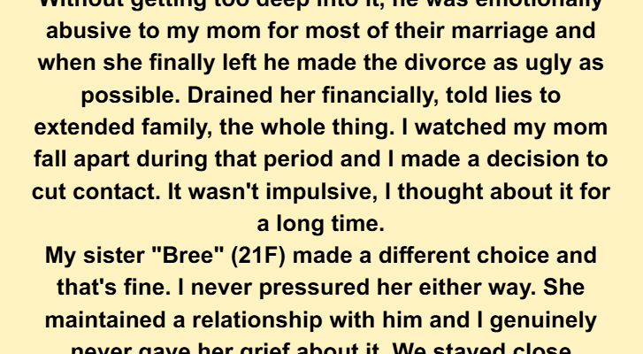 My sister “Bree” (21F) made a different choice and that’s fine. I never pressured her either way. She maintained a relationship with him and I genuinely never gave her grief about it. We stayed close throughout all of it which I’m proud of because it could have easily gone the other way.