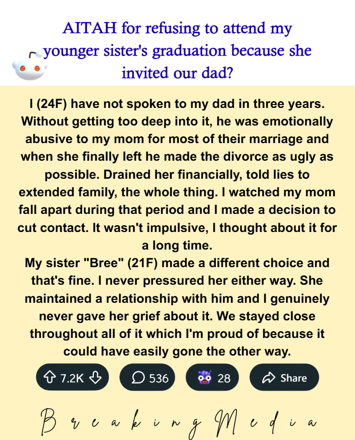 AITAH for refusing to attend my younger sister’s graduation because she invited our dad?