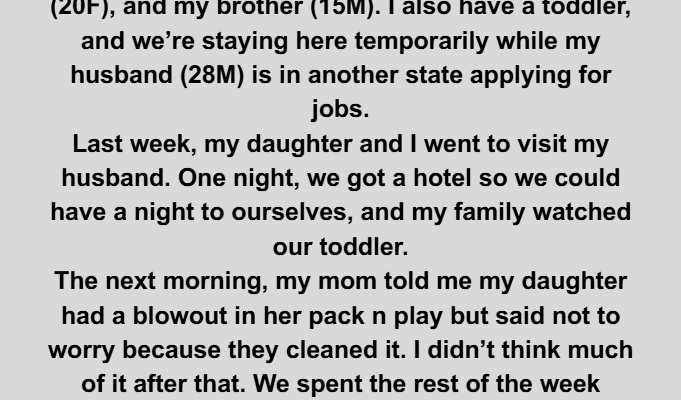 I think the confusion is the timeline, so I’ll clarify. I drove to my husband’s state first. We stayed one night at a hotel so we could have a night to ourselves while my mom and siblings watched my toddler back at their home. The next day, my mom brought my daughter to meet us, and we all spent the week together in the state my husband is currently living in. My mom and siblings were not with us during that week—they stayed at home. Then at the end of the trip, my daughter and I drove back home. When I got back, my mom mentioned the pack n play had still been “messy” and that they put blankets down on it for sleep/nap after the blow out happened a week ago. That’s when I realized it hadn’t actually been properly cleaned and dried out the whole time I was gone. So it wasn’t just one night of use—it was left in that condition not cleaned or touched the whole week we were gone.