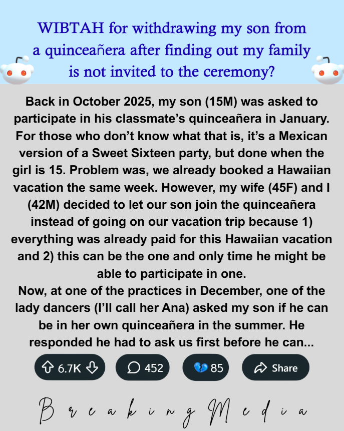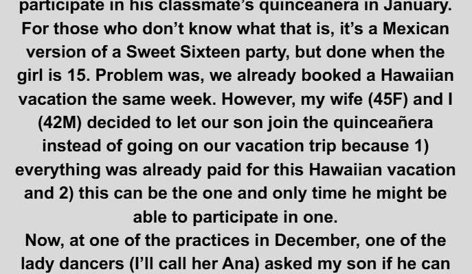 Back in October 2025, my son (15M) was asked to participate in his classmate’s quinceañera in January. For those who don’t know what that is, it’s a Mexican version of a Sweet Sixteen party, but done when the girl is 15. Problem was, we already booked a Hawaiian vacation the same week. However, my wife (45F) and I (42M) decided to let our son join the quinceañera instead of going on our vacation trip because 1) everything was already paid for this Hawaiian vacation and 2) this can be the one and only time he might be able to participate in one.