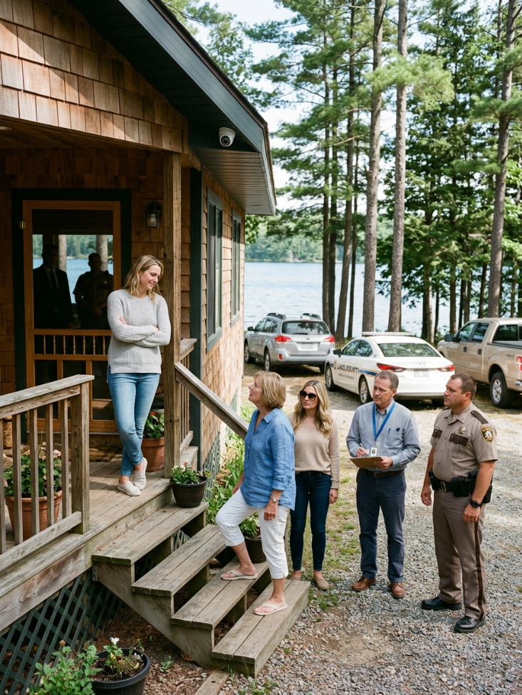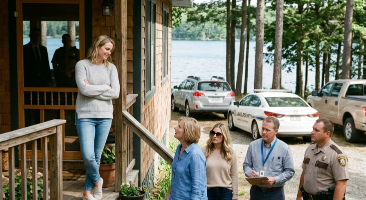 Not alone. Her silver SUV pulled into my gravel drive, its tires crunching aggressively, followed by a county-marked sedan and a tan pickup I didn’t recognize. From the porch, I saw my mother step out in white capris and a blue linen blouse, already wearing the expression she reserved for moments when she expected reality to bend to her will. Beside her came Paige in oversized sunglasses, looking thoroughly inconvenienced. From the county sedan emerged a nervous-looking man with a clipboard. And from the pickup stepped a young, broad-shouldered deputy in uniform.